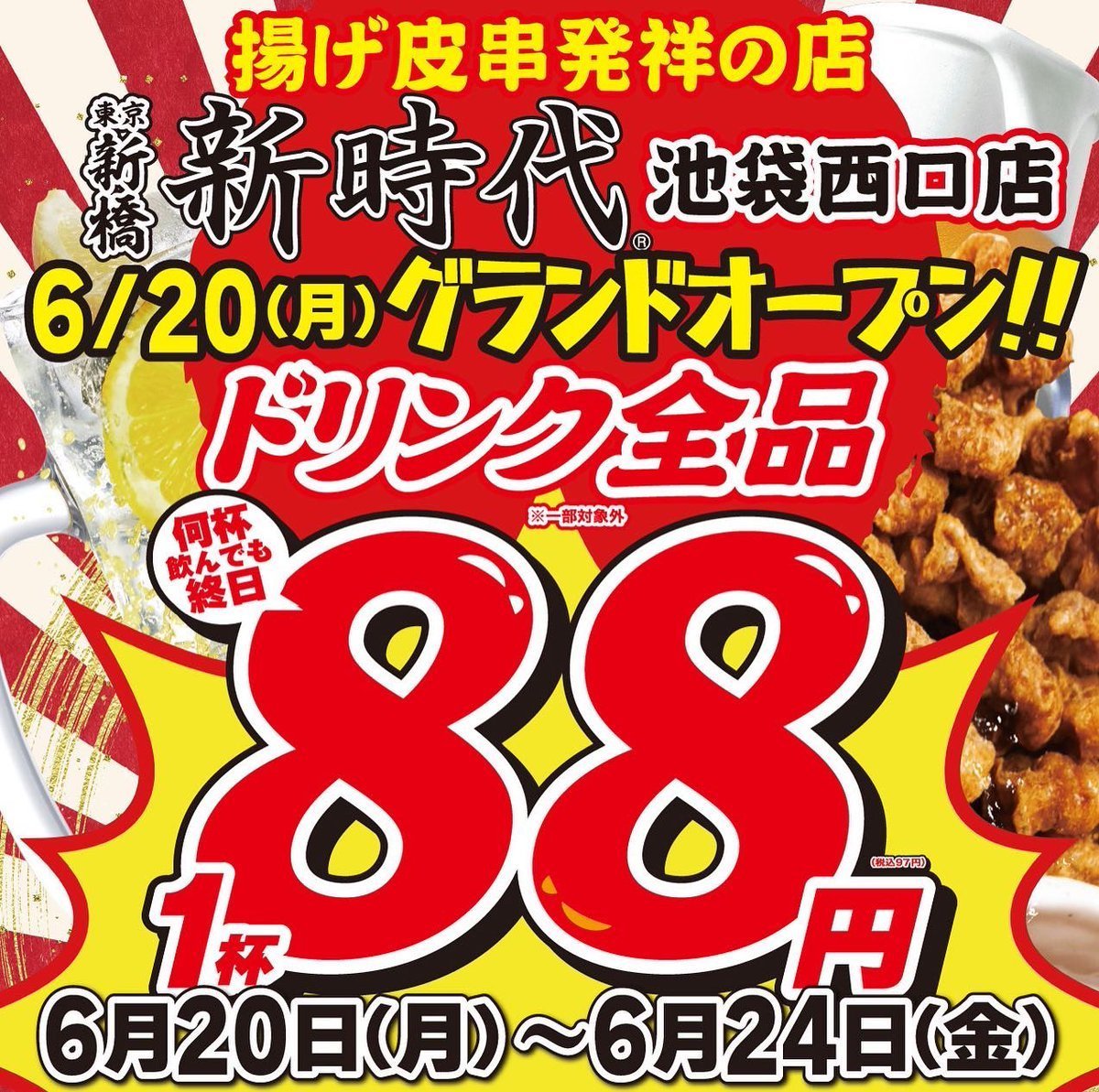 6/20(月)〜6/24(金)は、ドリンク全品88円🍻